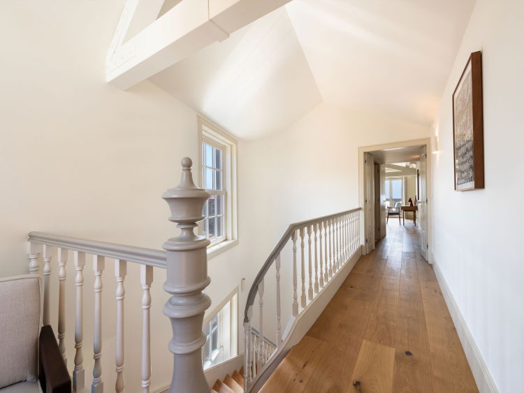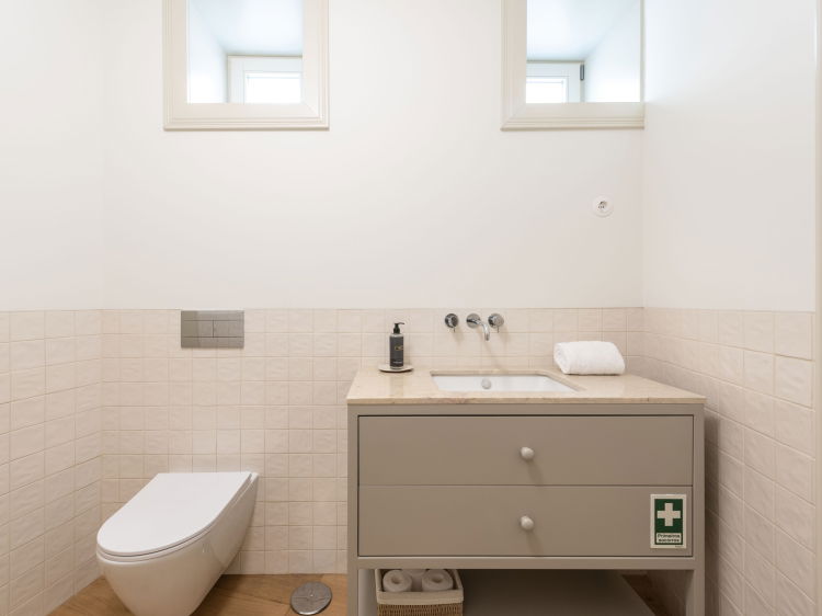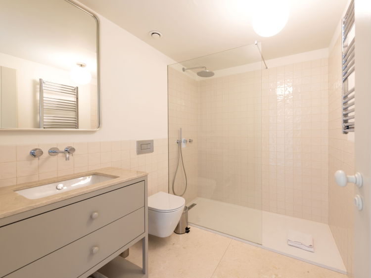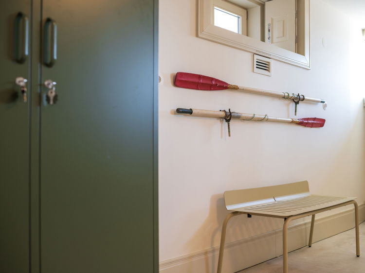 On the ground floor, you are welcomed by a large open space social area where the living room, dining space and kitchen flow naturally together. There is also a guest toilet. You will find books, board games, a TV and a bar style corner. On the first floor there is a small desk area, one bedroom with a shared bathroom, and a cosy suite with beautiful river views, a dressing area and a private bathroom. On the second floor, a reading nook awaits, as well as a very spacious suite with direct access to a lovely terrace, perfect for relaxing or enjoying a drink at sunset, always with the river mouth as your backdrop.