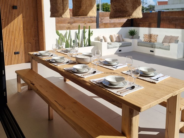 Beach Porto Corvo is a bright, two-storey house. A large open-plan living space combines lounge, dining area and kitchen, opening out through wide glass doors to a generous terrace. In the shade, a long table for eight, a shallow plunge pool just 60 cm deep — not for swimming, but perfect for cooling off, slipping in without effort, stretching out in the afternoon sun. There are sofas to sink into, and in one corner, as it should be, a barbecue.